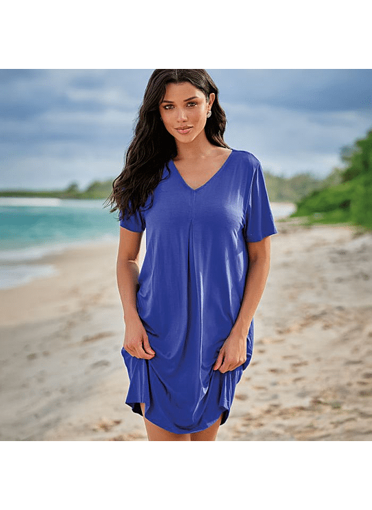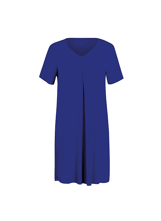De strandjurk overtuigt met een lichte, vloeiende silhouet en een aangenaam draagcomfort.De knielange lengte en de A-lijnvorm geven de jurk een losse silhouet.De V-hals wordt aangevuld met een decoratieve plooi onder de halslijn.Korte mouwen en de licht afgeronde zoom benadrukken het casual karakter van het model.Gemaakt van zacht vloeiende jersey is JACA een ongedwongen metgezel voor warme dagen.
