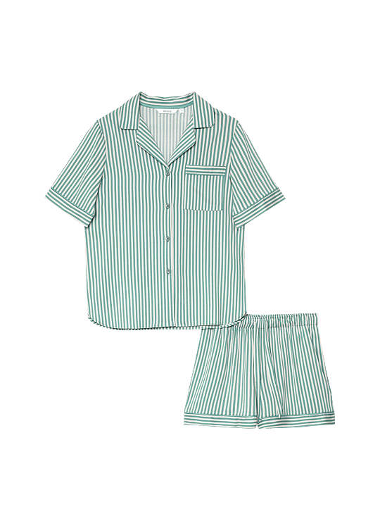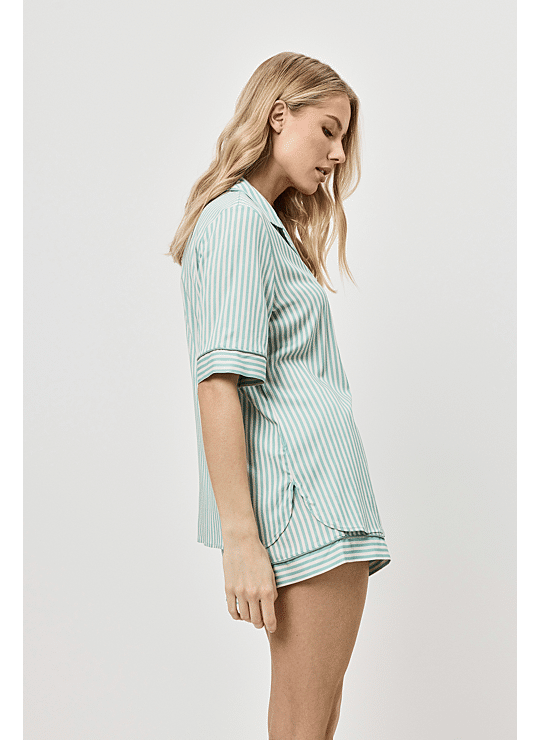 Stijlvolle en luchtige dames pyjama in een zachte viscosemix met stretch voor extra comfort. De frisse strepen en losse pasvorm maken dit setje perfect voor ontspannen nachten en relaxte ochtenden.