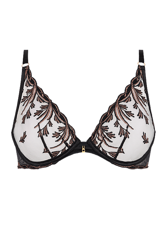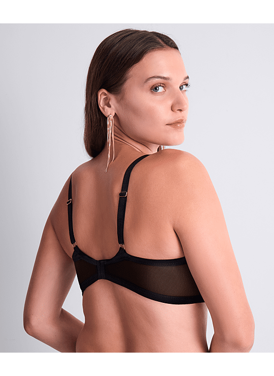 Ondersteunende triangel beugel BH met verfijnde borduursels en een elegant zwart-gestreept design. Deze Cosmic Romance BH combineert een verleidelijk diep decolleté met comfortabele ondersteuning en subtiele transparantie voor een vrouwelijke en luxueuze look. Perfect om je lingerielade een stijlvolle upgrade te geven.