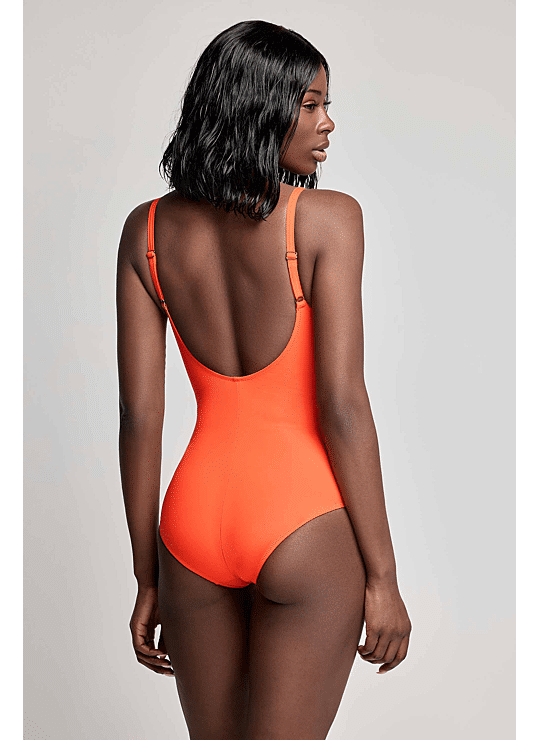 Stijlvol badpak met een tropische print in levendige oranje- en crèmetinten. De geplooide details aan de bovenzijde zorgen voor een flatterend effect, terwijl het effen oranje broekgedeelte een mooi contrast creëert en het silhouet elegant benadrukt. Ideaal voor een zelfverzekerde en zomerse strandlook.