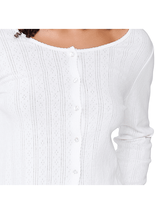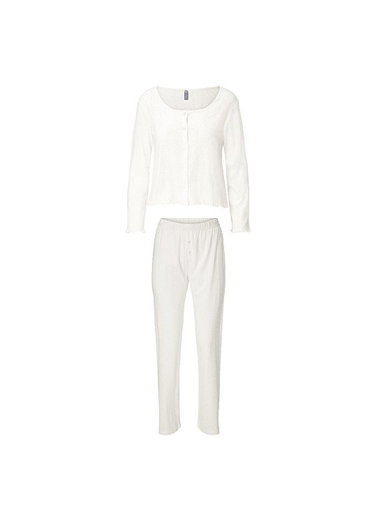 Cotton Comfy! Deze mooie, katoenen set bestaat uit een vest met knoopjes en een lange, rechte broek. De pointelle structuur in de stof geeft een romantische touch aan de set. Door de katoenen kwaliteit voelt de set soepel en ademend aan.