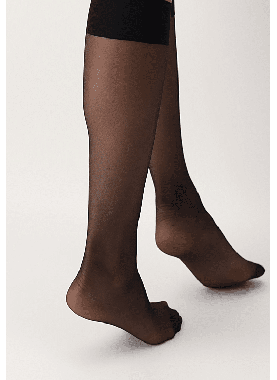 Transparante kniekousen van 15 denier, perfect voor dagelijks gebruik. Ze zijn vrijwel onzichtbaar op het been en hebben een elegante, matte uitstraling.De elastische boord ter hoogte van de kuit is zo ontworpen dat hij niet afzakt en niet knelt. De licht verstevigde teen vermindert het risico op ladders. De tenen blijven zichtbaar, terwijl dit deel iets minder transparant en extra stevig is.Dagelijks kniekousen dragen verbetert de pasvorm van de schoen en voorkomt vervelende wrijving.