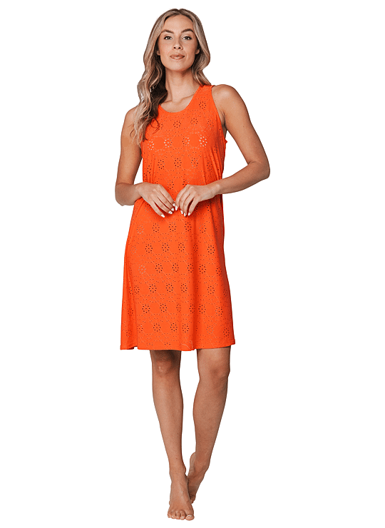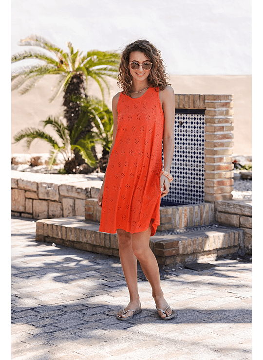 De jurk is uitgevoerd in een zonnige oranje kleur en heeft een mouwloos model met een ronde hals, wat zorgt voor een luchtige en vrouwelijke uitstraling. Het subtiele opengewerkte patroon geeft de jurk een speels en zomers effect.