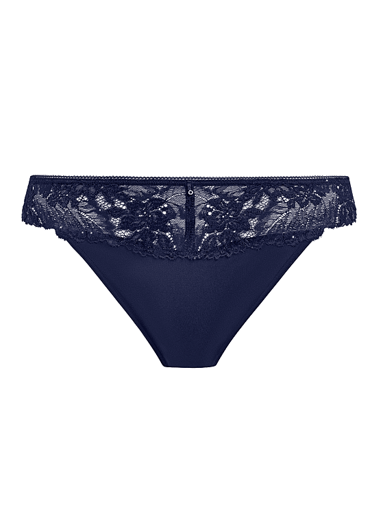Straal elegantie uit met onze meest goddelijke tanga in een donker saffierblauwe tint. Vakkundig ontworpen voor een lage pasvorm met minimale rugbedekking, combineert deze korte stijl weelderig zachte microvezel met fijne bloemenkant. Zorgvuldig geweven met subtiele micropailletten voor een zachte, glamoureuse uitstraling, is deze tanga een must-have in elke lingerielade.
